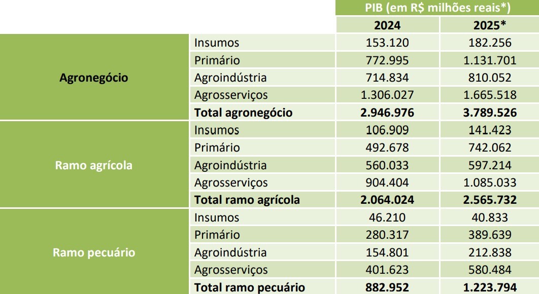 Com base nesse desempenho parcial, o PIB do agronegócio brasileiro pode alcançar R$ 3,79 trilhões em 2025, sendo R$ 2,57 trilhões no ramo agrícola e R$ 1,22 trilhão no ramo pecuário.