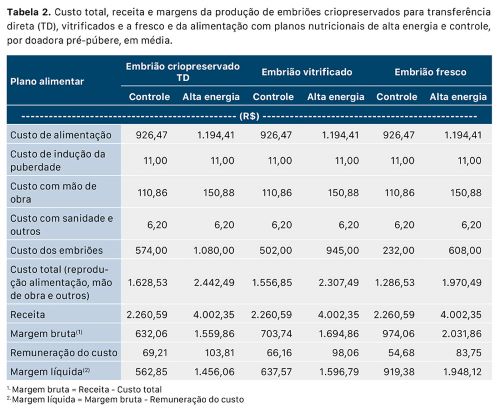 Por outro lado, o maior rendimento na produção de embriões pelos animais que receberam a dieta PN2 resultou numa receita média 77% maior que a do grupo controle. A margem bruta no tratamento PN2 durante a recria foi 2,7 vezes maior que a do PN1 para embriões TD, 2,6 vezes maior para embriões vitrificados e 2,1 vezes maior para embriões a fresco. Já a margem líquida do plano alimentar PN2 foi 2,8 (embriões TD), 2,7 (embriões vitrificados) e 2,2 (embriões a fresco) vezes maior que no plano alimentar controle. Na comparação entre as técnicas de produção e processamento de embriões, as maiores margens foram obtidas com a produção de embriões a fresco.