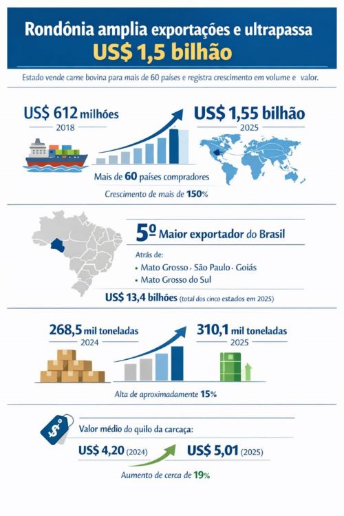 Com vendas alcançando mais de 60 países, Rondônia saiu de US$ 612 milhões, em 2018, para US$ 1,55 bilhão em exportações de carne bovina.As garantias sanitárias mantidas pelo Estado de Rondônia têm impactado diretamente na abertura e consolidação de mercados internacionais para a exportação de carne bovina e derivados. Em 2025, o estado alcançou US$ 1,55 bilhão em exportações do setor, posicionando-se entre os cinco maiores exportadores de carne bovina do Brasil, atrás apenas de Mato Grosso, São Paulo, Goiás e Mato Grosso do Sul. Juntas, essas cinco unidades da federação somaram mais de US$ 13,4 bilhões em vendas externas no período.