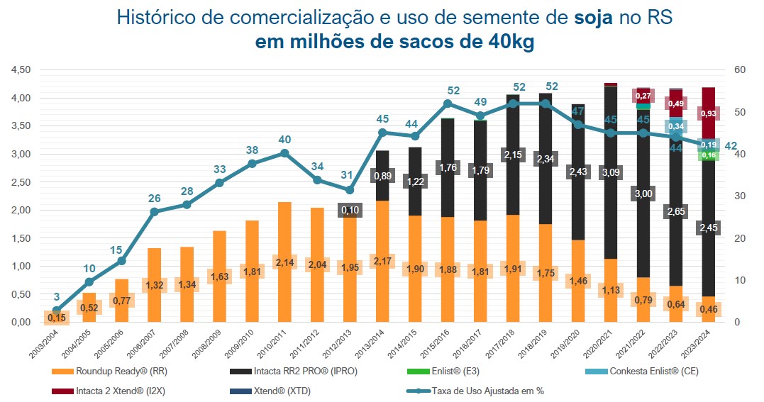 Conforme levantamento da Apassul, com base no histórico de comercialização e uso de semente de soja no Rio Grande do Sul (safra 2023/2024), as biotecnologias mais utilizadas nas lavouras são: Intacta RR2 PRO (IPRO), que representa 31% das sementes certificadas; Intacta 2 Xtend, com 11%; Roundup Ready (RR), com 6%; e as demais com 2% cada biotecnologia.