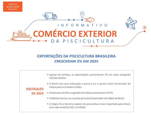 Essas e outras informações estão disponíveis gratuitamente no Informativo de Comércio Exterior da Piscicultura, que pode ser acessado neste link. A edição 24, que acaba de ser publicada, refere-se a 2025. O informativo tem periodicidade trimestral e a Associação Brasileira da Piscicultura (PeixeBR) é parceira na elaboração. O boletim é resultado do projeto BRS Aqua, coordenado pela Embrapa.